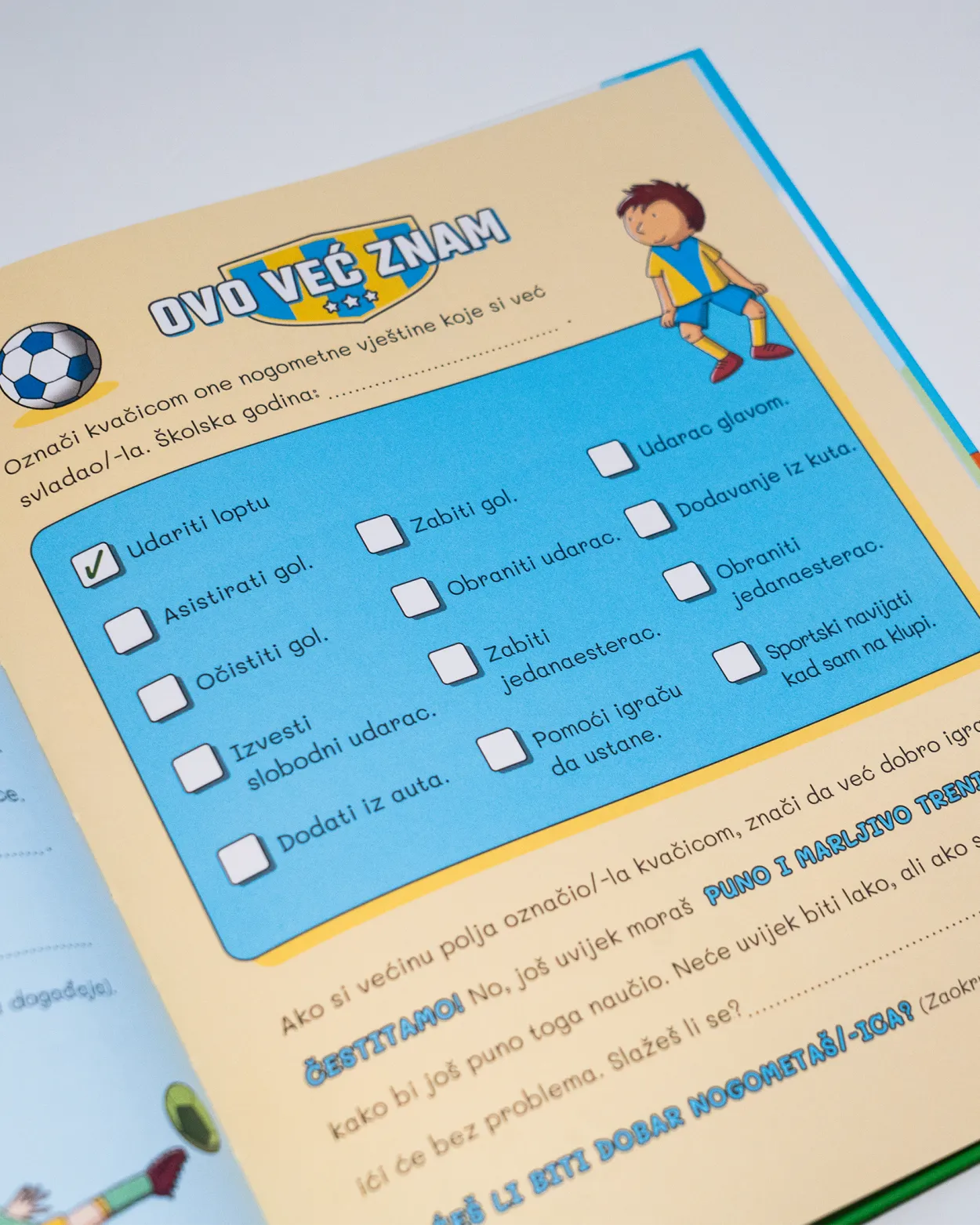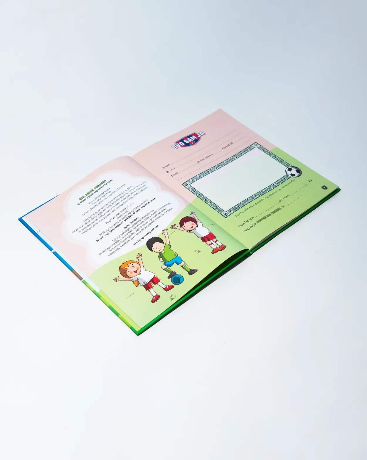 Hej, igram nogomet savršen je spomenar za sve mlade nogometaše i nogometašice! Ova interaktivna knjiga sadrži sve o nogometu, od svlačionice i terena, preko pravila igre i ključnih aktera, pa sve do samog gledanja utakmica. Spomenar omogućuje uživanje u crtanju i bojankama te uključuje razne igre koje će zabaviti i educirati mlade sportaše. Tu su i kalendari za praćenje treninga i utakmica, kao i pravila za roditelje djece u sportu, ali i fair play dijela koji je iznimno bitan u razvijanju sportaša. Svaka stranica ovog spomenara osmišljena je kako bi potaknula ljubav prema nogometu i sportskoj aktivnosti te razvila dječju kreativnost i maštu. Uz ovaj spomenar, svako dijete može ovjekovječiti svoje nogometne avanture i uspomene - neka nogomet postane dio svakodnevnog života vašeg djeteta uz Hej, igram nogomet.