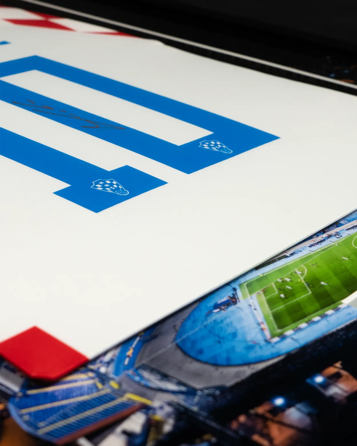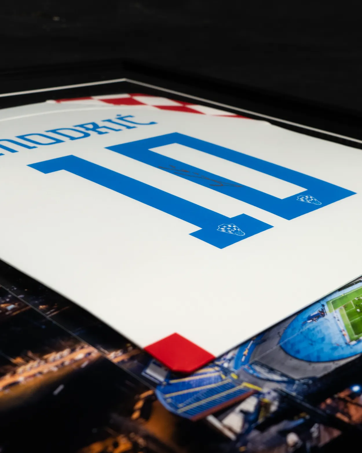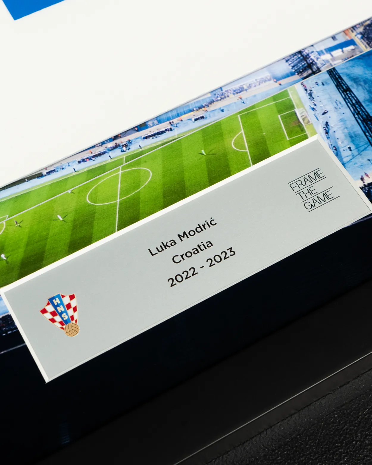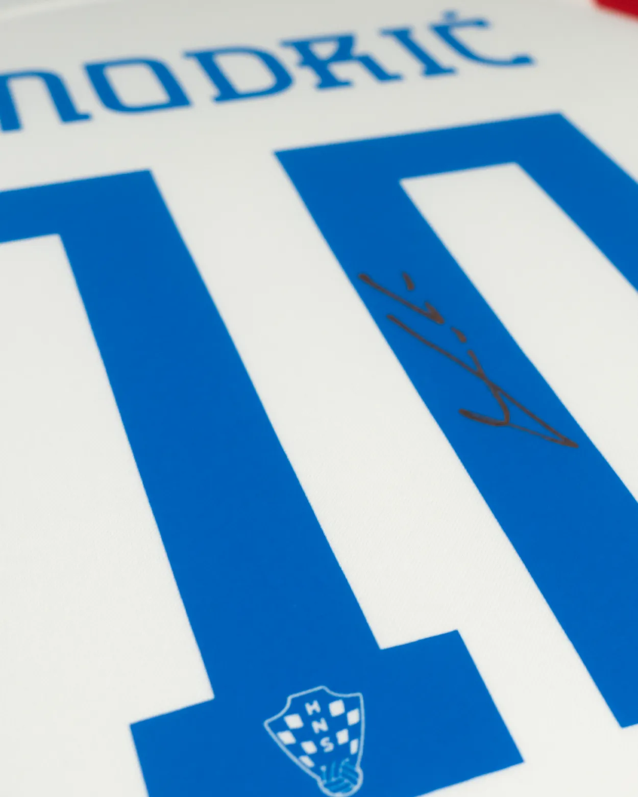 Potpisan od strane Luke Modrića, ovaj domaći dres Hrvatske za sezonu 2022-23 ima grb države reproduciran u uzorku šahovnice na tkanini. Prednja strana dresa odabrana je za izlaganje. Modrićev potpis nalazi se u središtu dresa, između njegovog broja i Nikeovog loga.