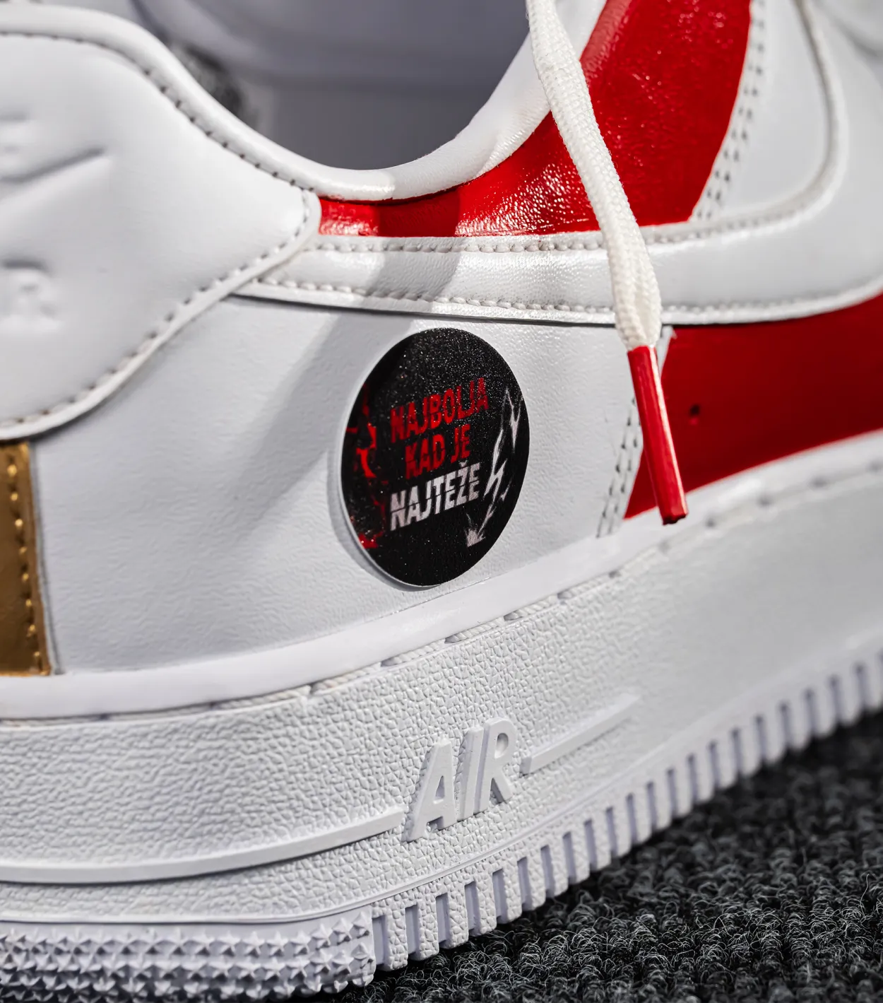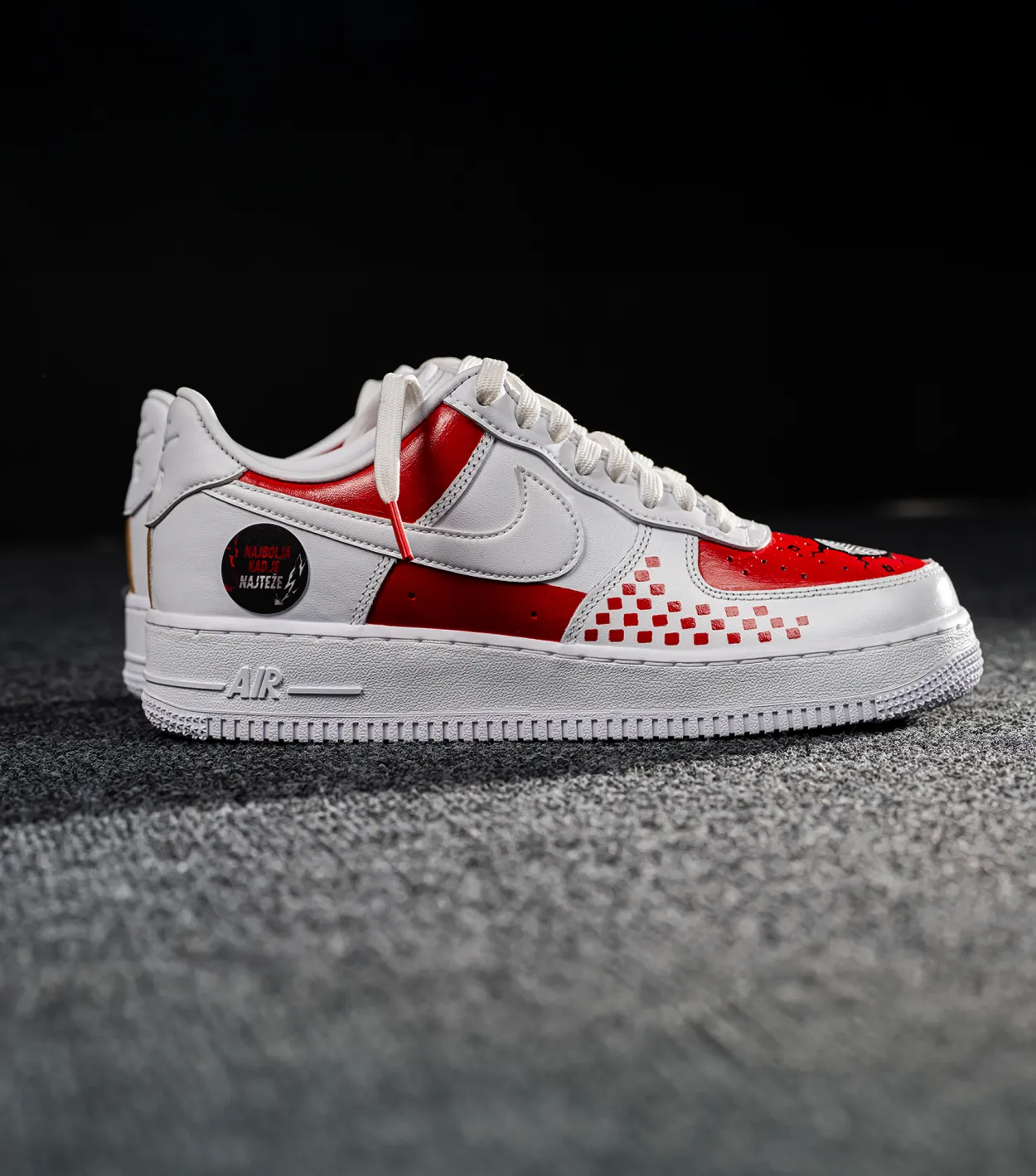Limitirano unisex izdanje Air Force 1 CROATIA ’07 Fresh, kreirano je kao počast izrazito prepoznatljivom simbolu Vatrenih. Ručno oslikani motivi u crveno-bijelim tonovima, nogometna lopta, grb Hrvatskog nogometnog saveza s jedne strane te natpis „Najbolja kad je najteže“ s druge, daju svakom paru karakter i vizualni identitet koji se ne ponavlja. Svaki model obrađen je individualno, što znači da svaki par nosi vlastiti potpis i dozu autentičnosti — idealno za kolekcionare i sve koji žele istaknuti pripadnost Vatrenom duhu na moderan način.