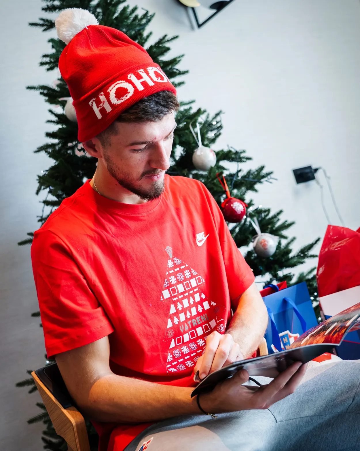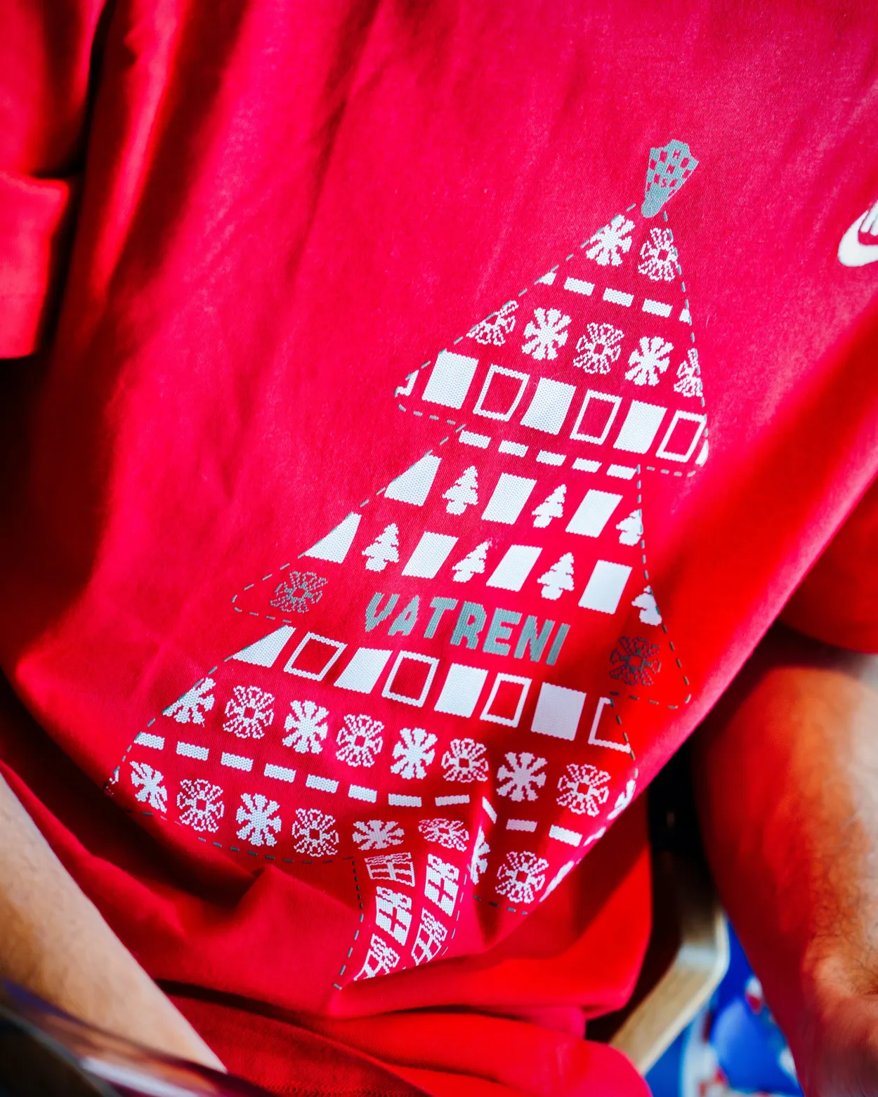 Majica “Drvce Vatreni” donosi blagdanski motiv božićnog drvca čiji je vrh ukrašen HNS grbom, dok se u središtu ističe natpis “Vatreni”. Izrađena od 100% pamuka, pruža udobnost i prirodan osjećaj tijekom nošenja. Mali Nike Swoosh s natpisom “Nike” smješten je na lijevoj strani prsa. Ova majica spaja navijački ponos i božićni duh u jednostavnom, modernom izdanju. Održavanje je navedeno na etiketi proizvoda.